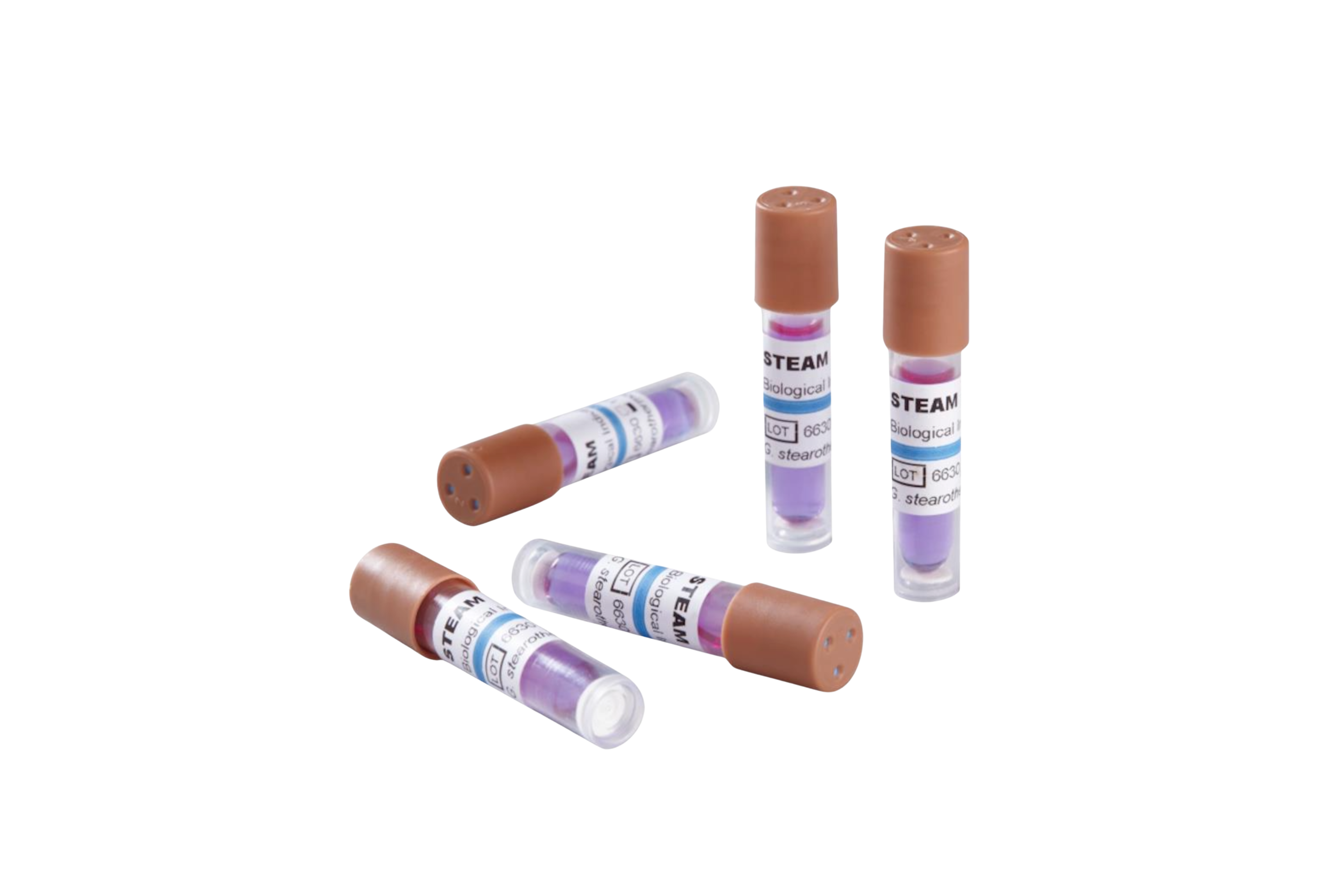 Sporer De fleste biologiske indikatorer indeholder specifikke arter af sporer, som Geobacillus stearothermophilus (ofte brugt til dampsterilisering) eller Bacillus atrophaeus (ofte brugt til tør varme- eller gassterilisering). Disse spores er valgte på grund af deres høje resistens over for sterilisation.