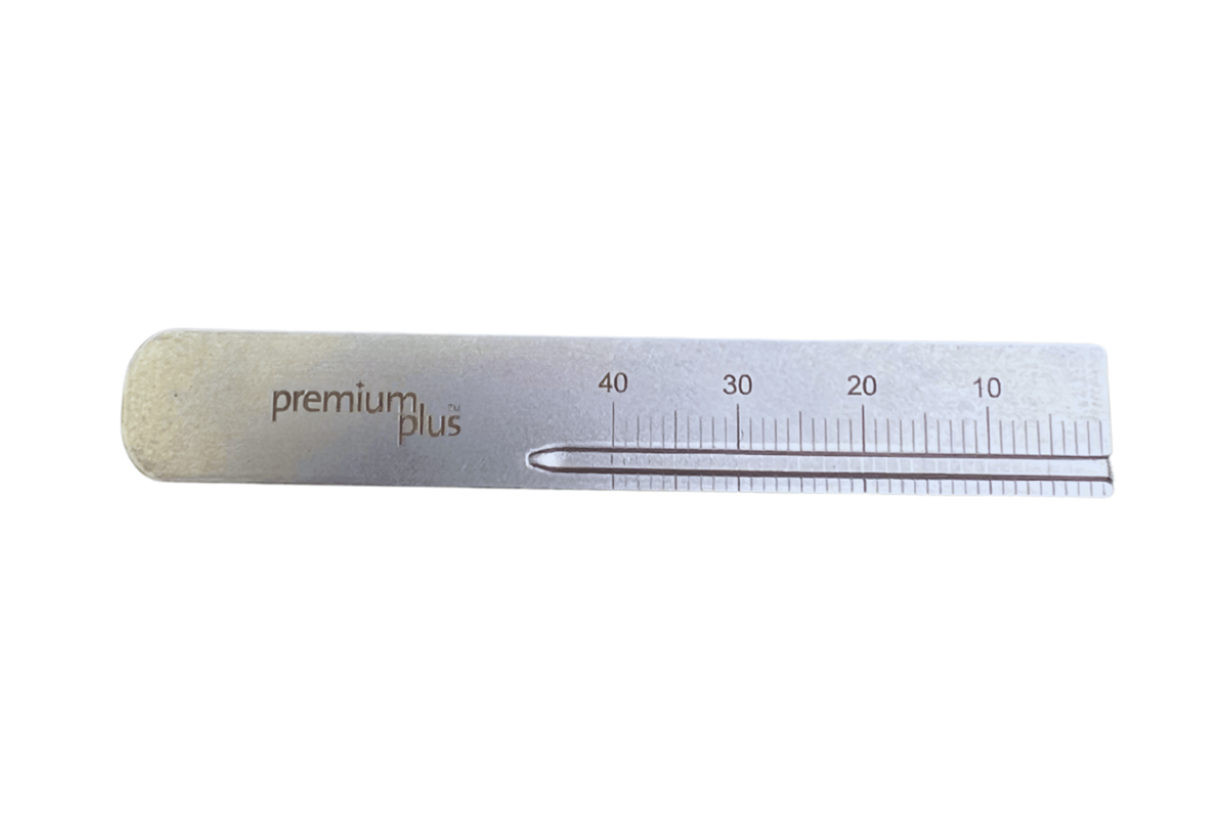 Måler: L80 mm x D12,5 mm x H3 mm Rustfrit stål. Autoklaverbar.
