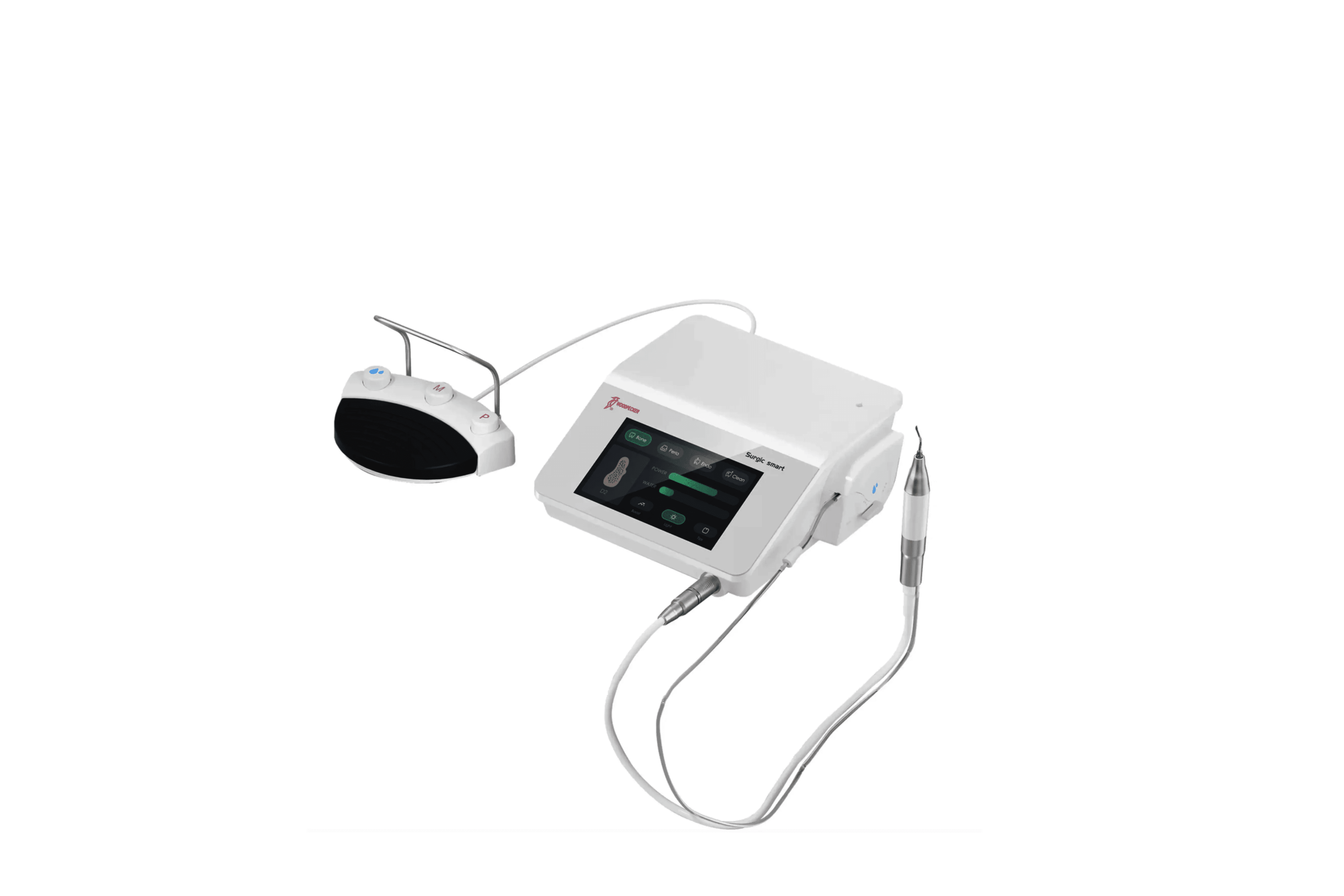 Enhed, Fodkontakt, 2 stk håndstykker, 2 spidsholder, 2 steribokse, 2 torque nøgler,